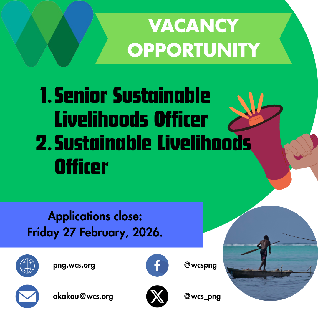 The Sustainable Livelihoods Officer will design, implement, and support community-based livelihood initiatives that strengthen household resilience while reducing pressure on biodiversity. The role focuses on developing environmentally sustainable, culturally appropriate income-generating activities in partnership with local communities, aligning livelihood outcomes with conservation goals. The position works closely with Community-Based Organizations (CBOs), customary landowners, women and youth groups, and local leaders to co-design, implement, and monitor sustainable livelihood activities. The officer will support participatory planning, community consultation, and capacity building while strengthening community ownership and long-term sustainability of interventions. The position requires travel within PNG, especially to WCS field sites in the Highlands and to the marine programme sites in New Ireland, West New Britain and Manus.