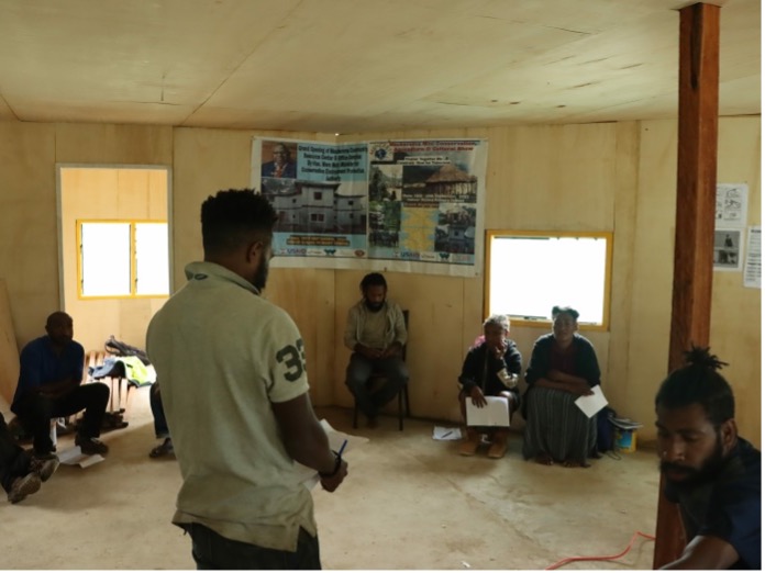 Image 10. The presentation of the C4C selection methodology and results were presented to local authorities as well as the future steps, expected benefits and potential costs to the community, as part of the FPIC process. They were all impressed by the quality of the best move made by Kaupa Emeruge. © WCS PNG |